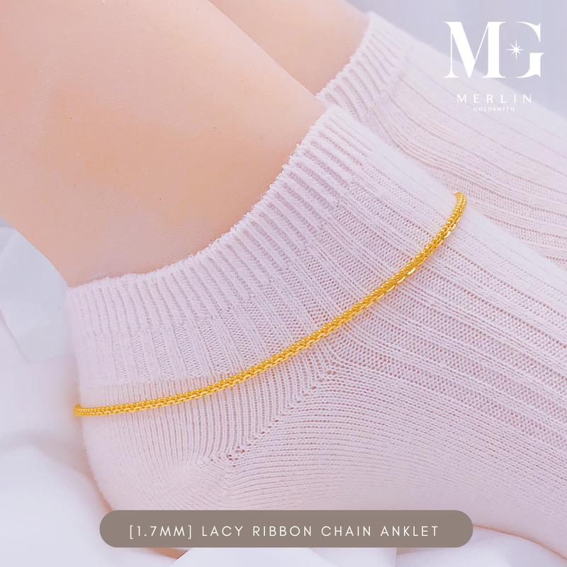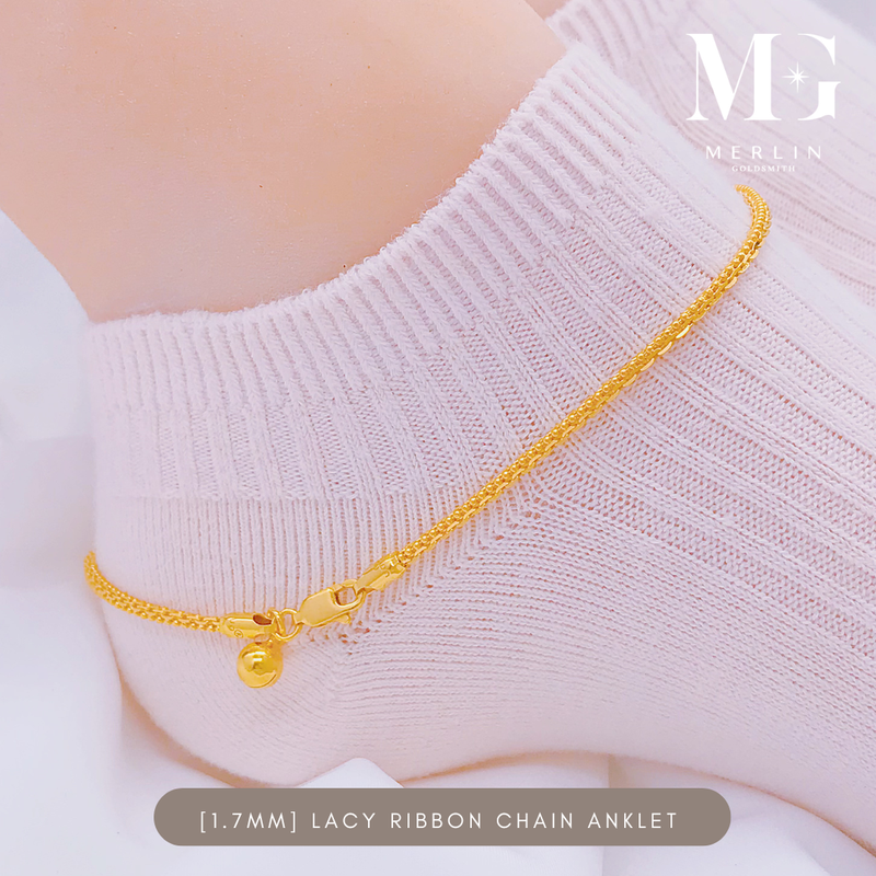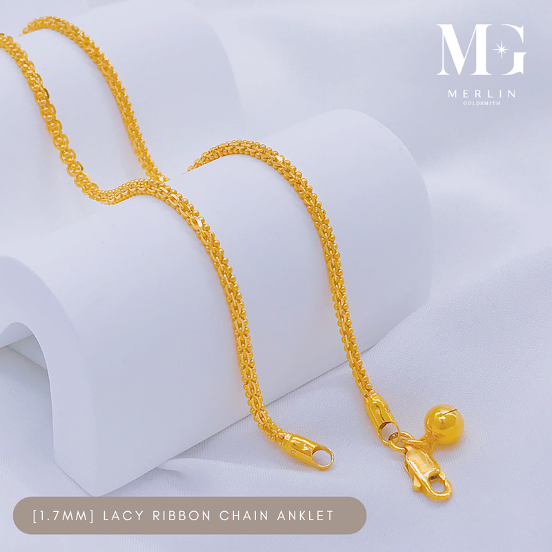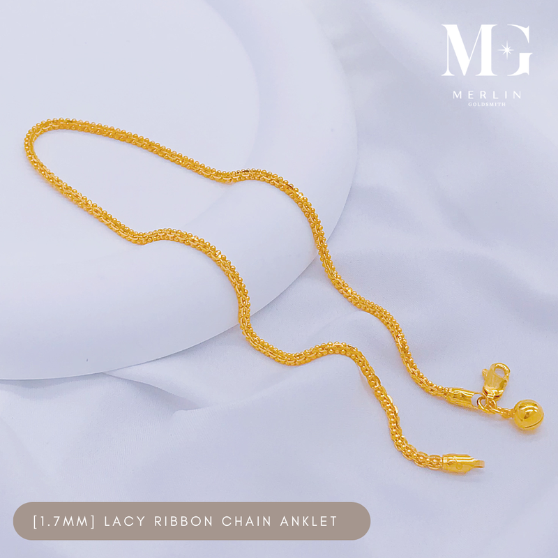 916 Gold (1.7mm) Lacy Ribbon Chain Anklet with Dangle Bell