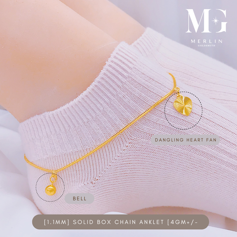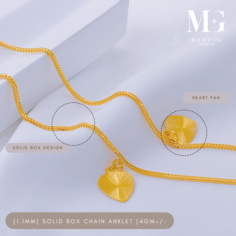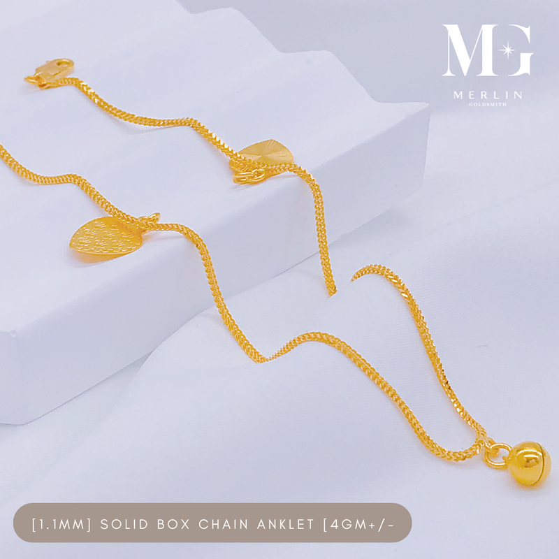 Crafted in 916 gold, this solid box chain anklet offers a sleek and timeless shine. Its 1.1mm thickness gives it a sturdy yet elegant look, perfect for everyday wear or layering with other anklets.