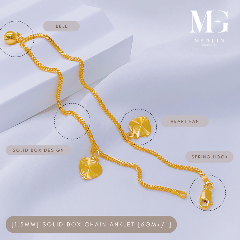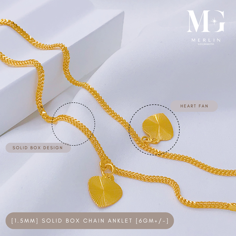 Crafted in 916 gold, this solid box chain anklet offers a sleek and timeless shine. Its 1.5mm thickness gives it a sturdy yet elegant look, perfect for everyday wear or layering with other anklets.
