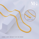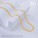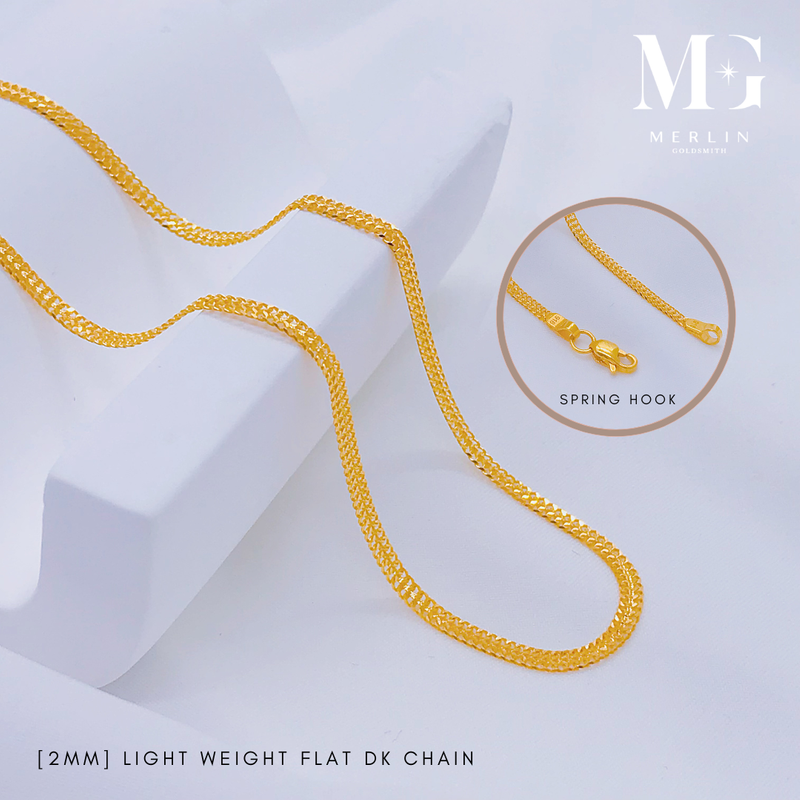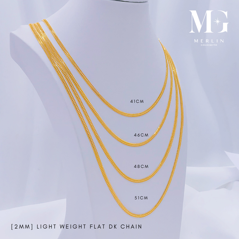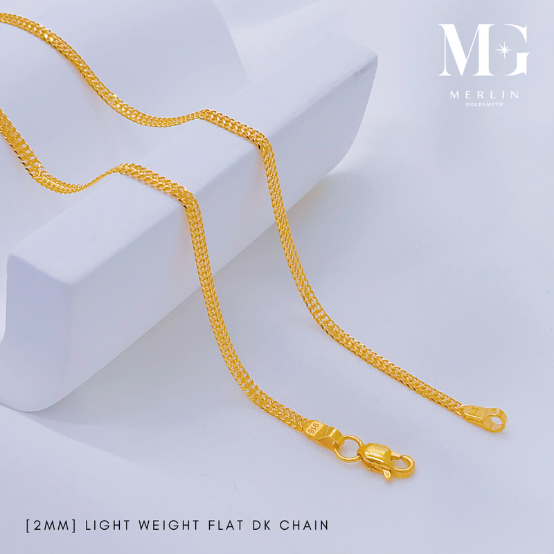 A stylish 916 gold flat DE chain, weighing lightly at 2mm thick, and available in multiple lengths. Its flat links offer a reflective surface that maximizes the gold's brilliance for a statement look.