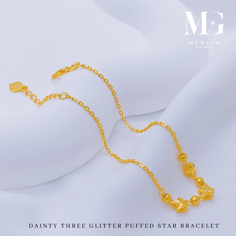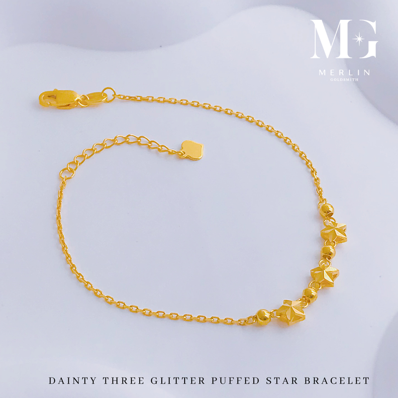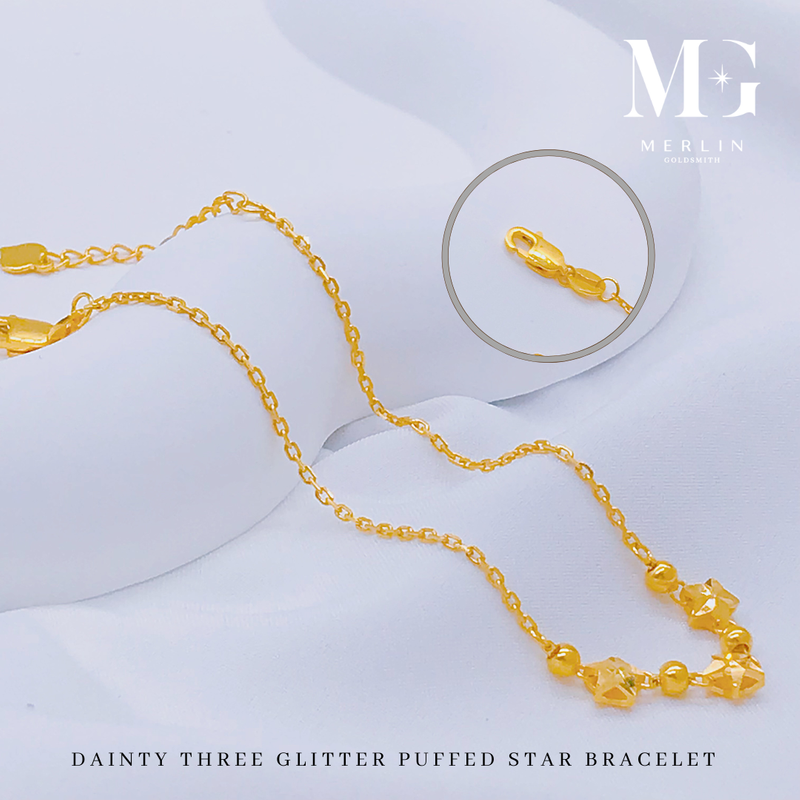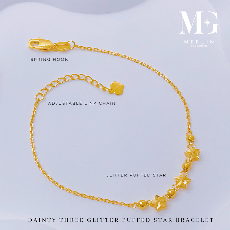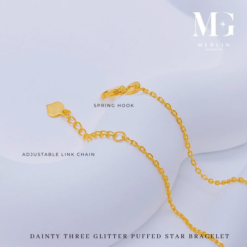 Shine bright with the Dainty Three Glitter Puffed Star Bracelet, exquisitely made in 916 Gold. The textured "glitter" finish on the puffed stars adds unique sparkle, making this minimalist 22K gold bracelet ideal for stacking or wearing alone.