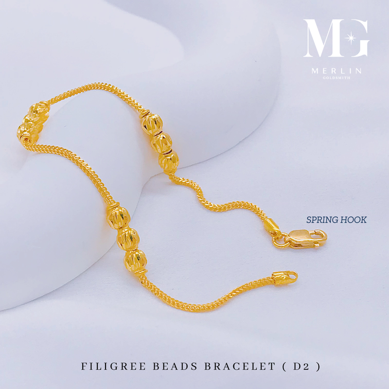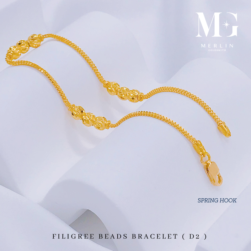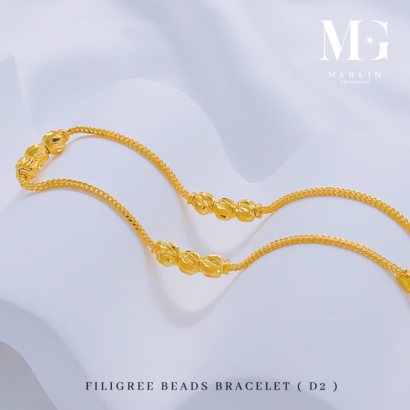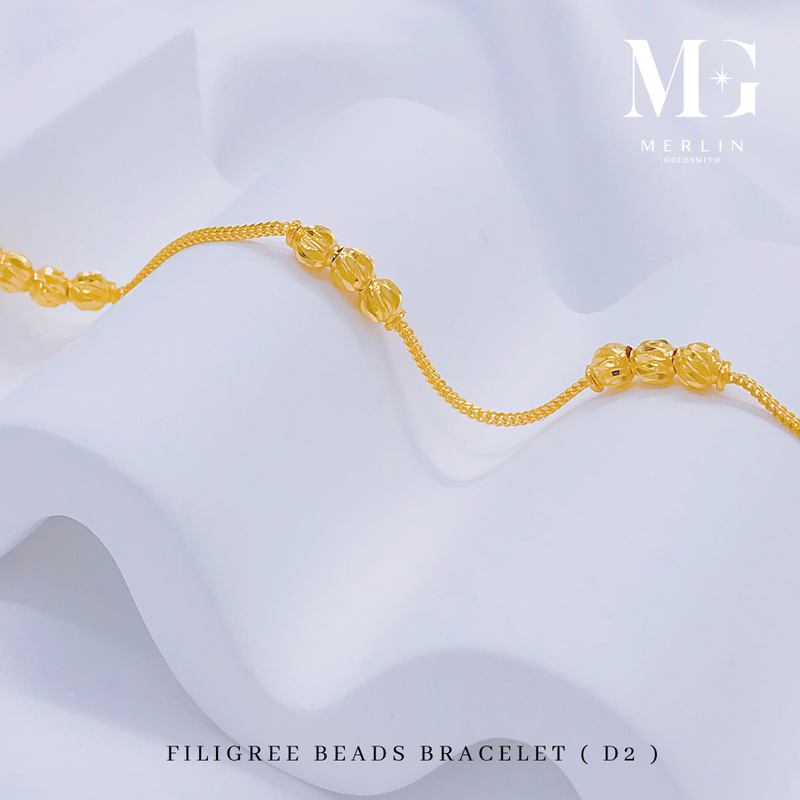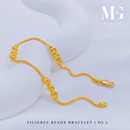 Showcase elegance with the Filigree Beads Bracelet (D2), a stunning variation of classic design in 916 Gold. The ornate gold beads are spaced perfectly on a durable chain, offering a luxurious and heritage-inspired look in pure 22K gold.