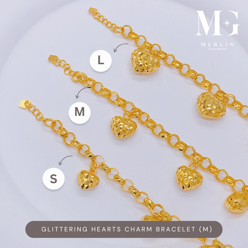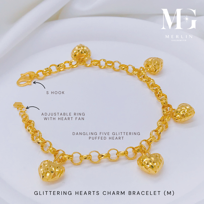 This medium-sized version offers a balanced look with slightly larger puffed hearts that catch the light beautifully. A versatile bracelet that complements any outfit from casual to dressy.