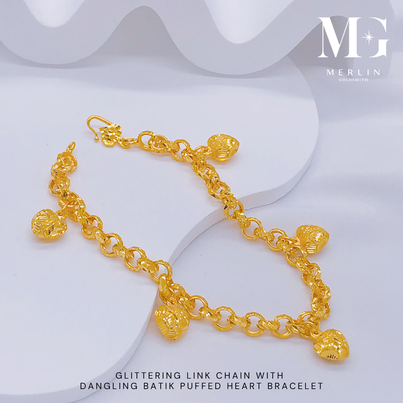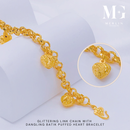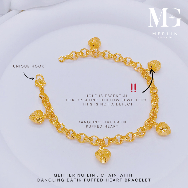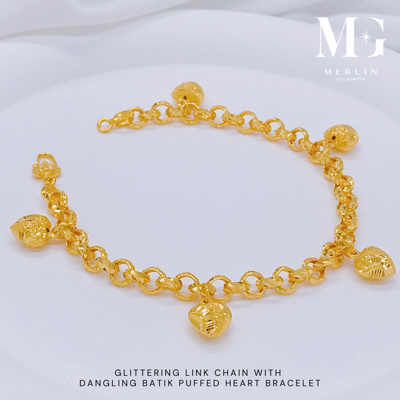 916 Gold Glittering Link Chain With Dangling Batik Puffed Heart Bracelet