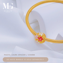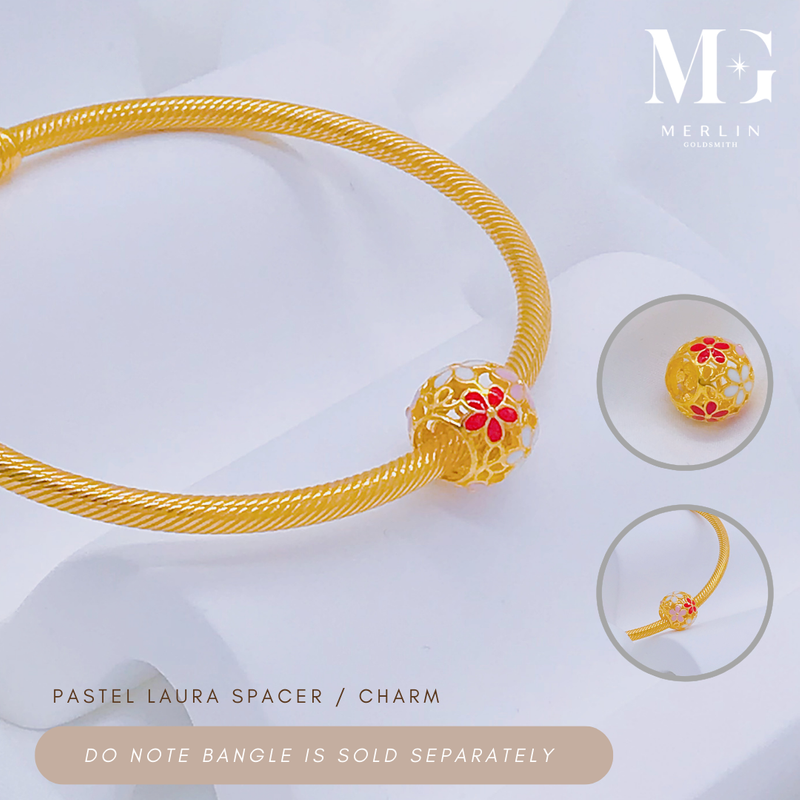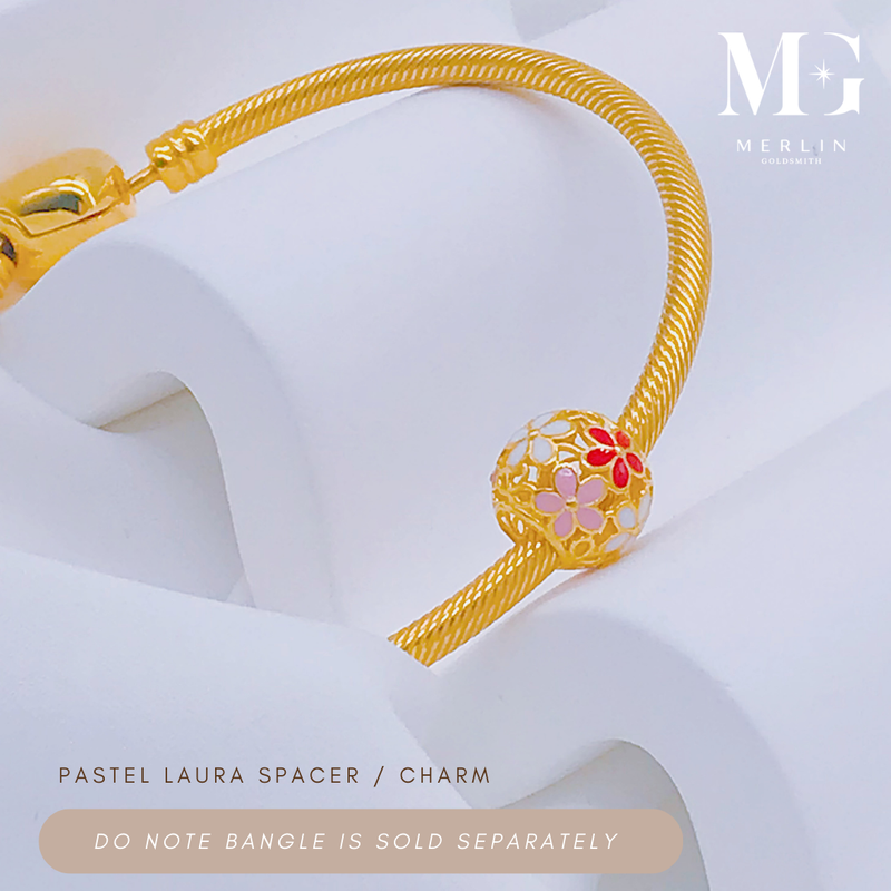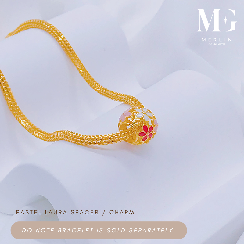 A round spacer adorned with soft pastel floral motifs, crafted in 916 gold with pops of vibrant enamel. A sweet and colourful accent to brighten any bracelet.