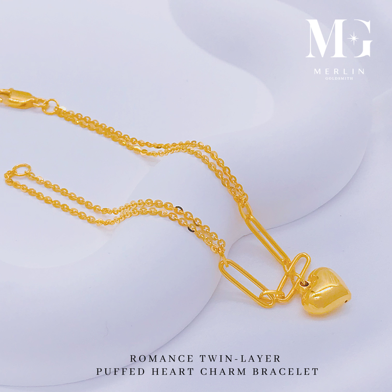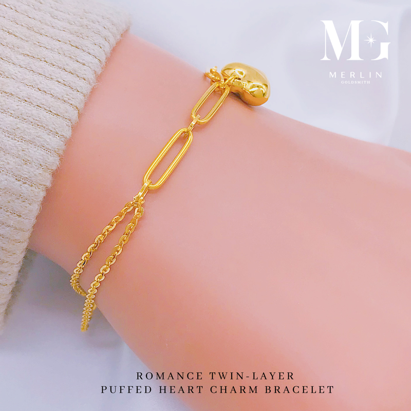 Double the love with the Romance Twin-Layer Bracelet, crafted in premium 916 Gold. Featuring a glossy puffed heart charm on a trendy dual chain, this 22K gold bracelet is the ultimate romantic gift or stylish statement piece.