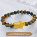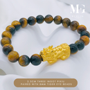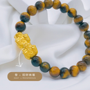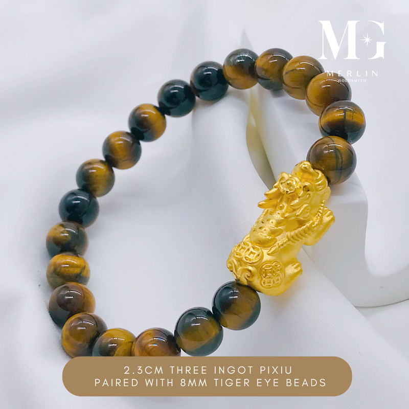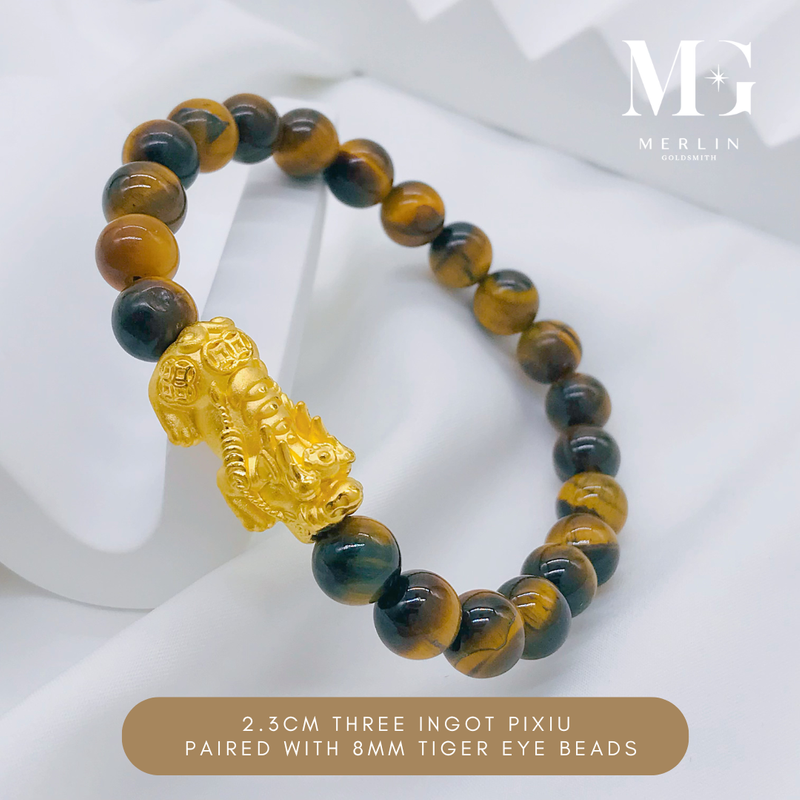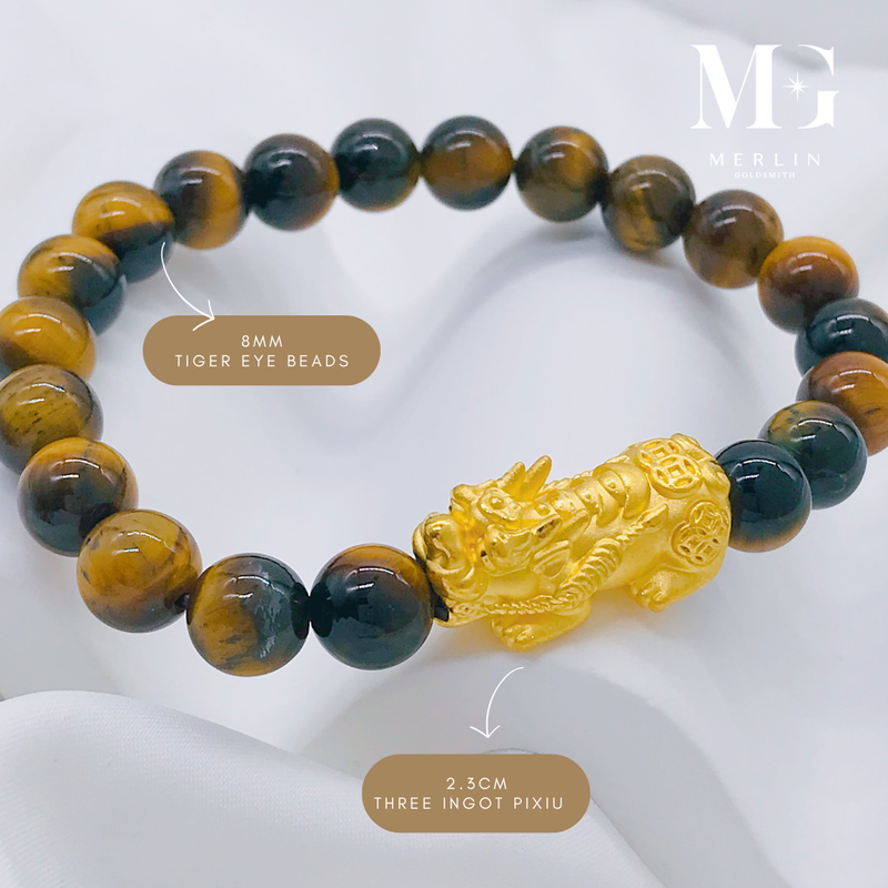999 Pure Gold 2.3cm Fortune Coin With Ingot Pixiu Paired With 8mm Tiger Eye Beads Bracelet