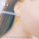 This 999 Pure Gold Heart Ear-Chain is a delicate and elegant accessory, featuring a minimalist heart motif suspended from a fine chain. Crafted from 24K gold, it offers a radiant shine and timeless appeal. With a full length of 10.3 cm and a weight of approximately 3.19 grams, this piece is ideal for those seeking a subtle yet meaningful touch to their jewellery collection.